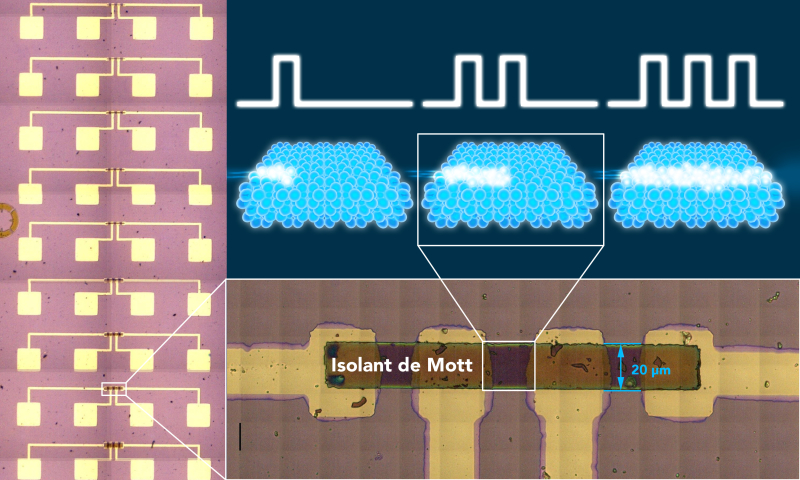 Réalisation du premier neurone artificiel de type "LIF" à base d'isolant de Mott et illustration du phénomène d’intégration lors de l'application d'impulsions électriques. © IMN (CNRS/Nantes Université) avec "Com par l’image".